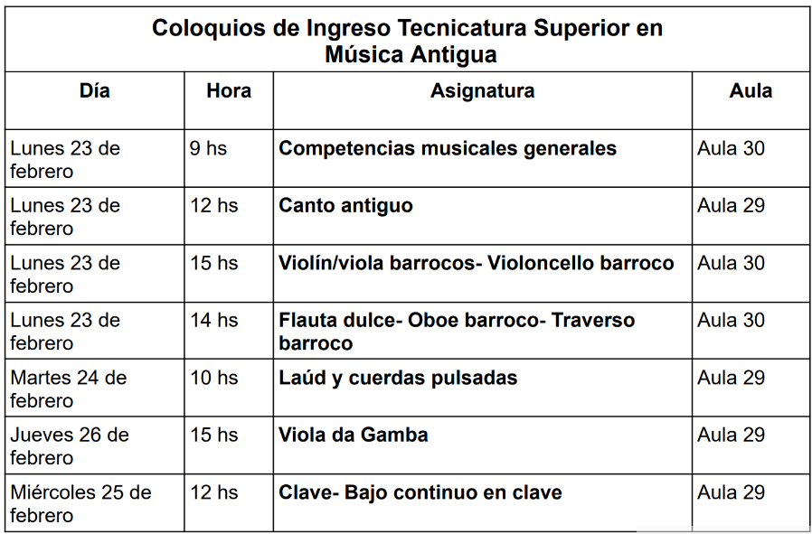 Para los COLOQUIOS ESPECÍFICOS de CANTO e INSTRUMENTO se conversará sobre la experiencia de los aspirantes al ingreso en la práctica de la música que se estudiará en la Carrera. Los COLOQUIOS ESPECÍFICOS se realizarán sobre el INSTRUMENTO ANTIGUO. La Institución cuenta con Instrumentos para estudio dentro del Conservatorio.